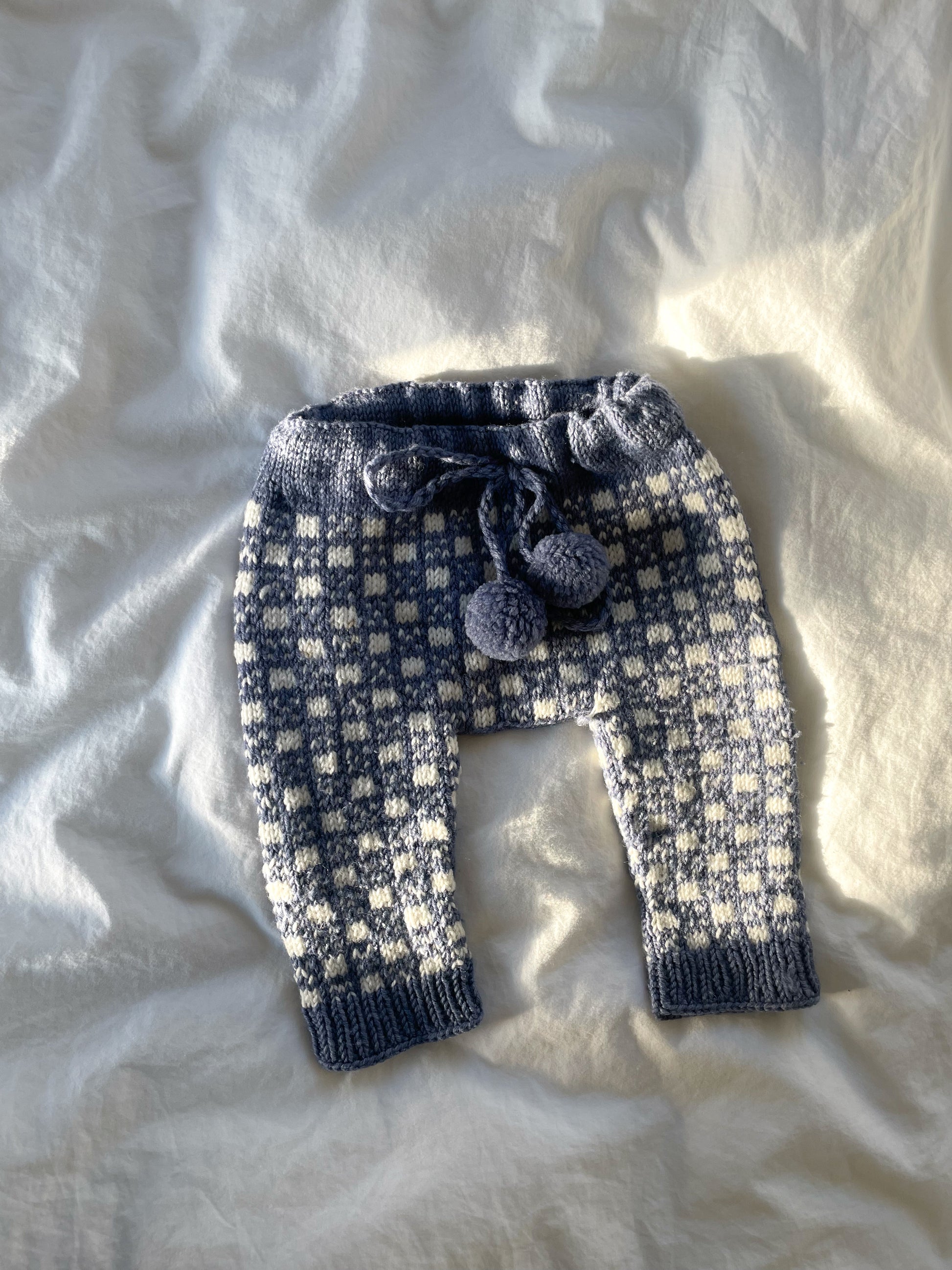 Smukke håndstrikkede bukser med mønster og pom pom'er, strikket i uld.