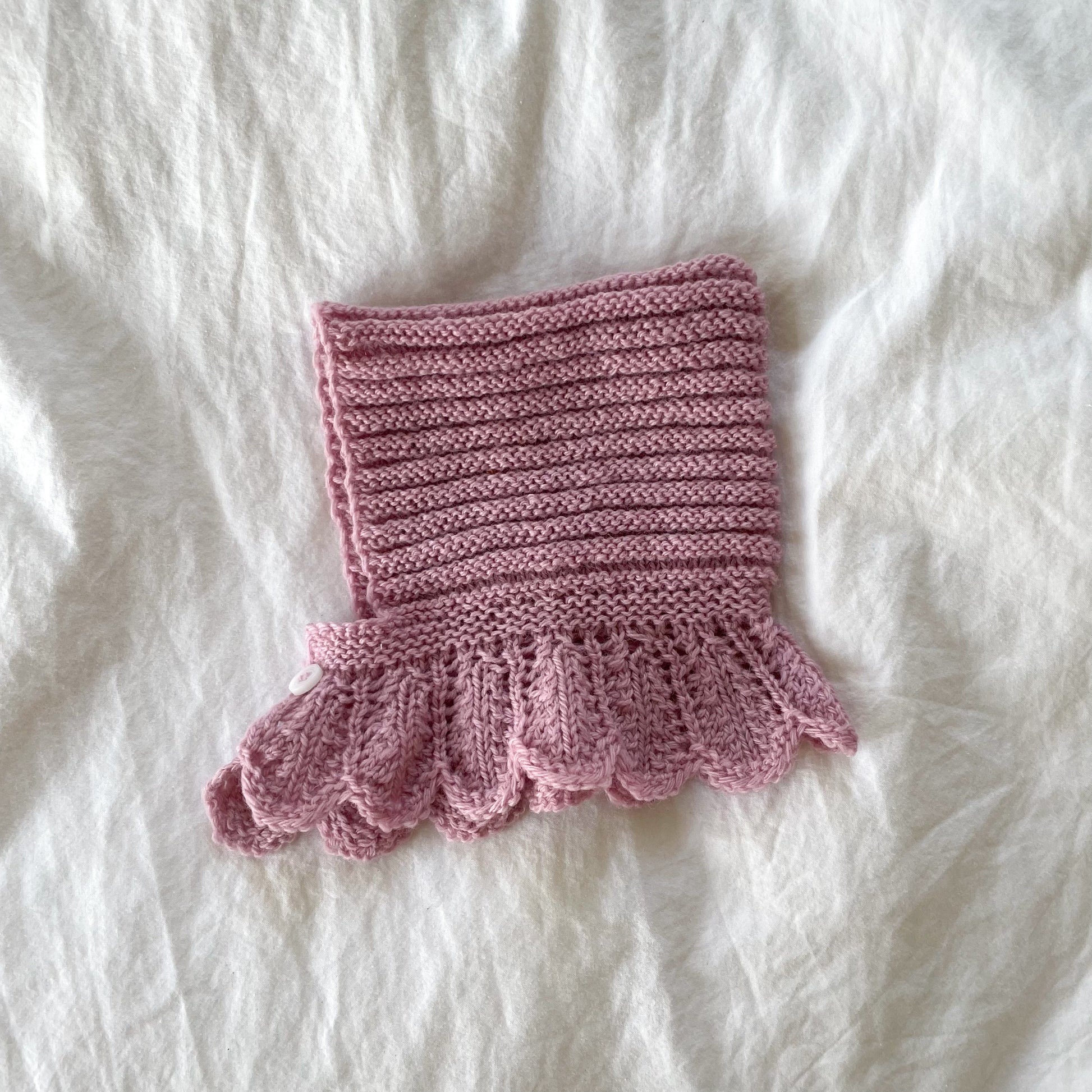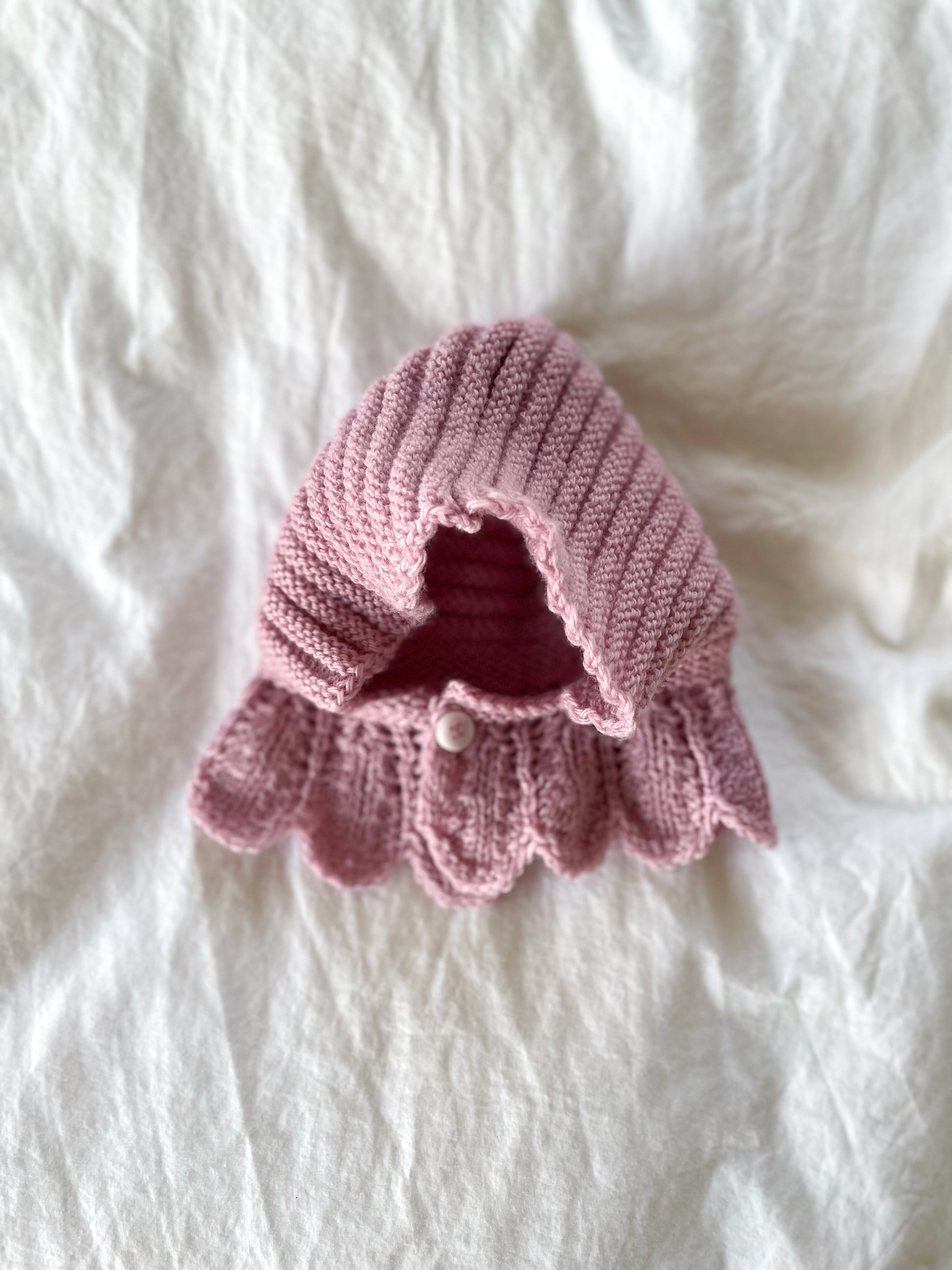 Fineste lille elefanthue med yndig kant, i smuk støvet rosa. Strikket i blød Merinould. Vaskes ved 30 grader