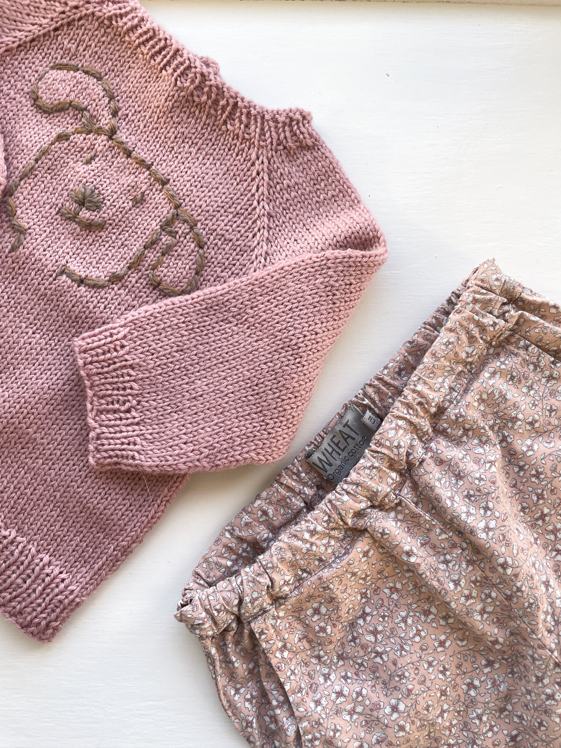 Skøn lys lyngfarvet strikbluse med broderet bamseansigt, strikket i Merino, dejlig blød.