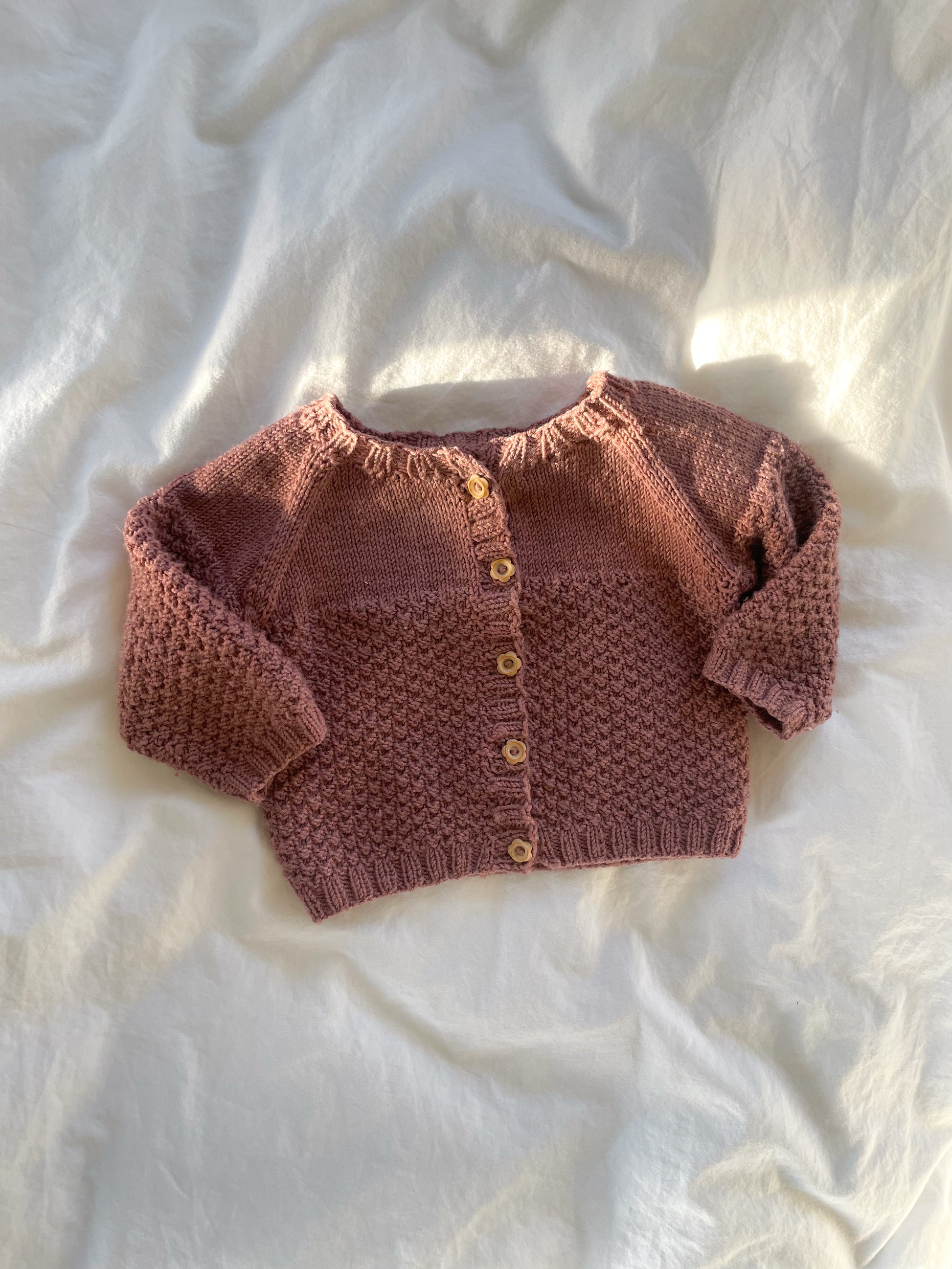 Fin gammelrosa cardigan, strikket i merino uld og isat fine knapper med blomsterform.Størrelse62StandNæsten som ny