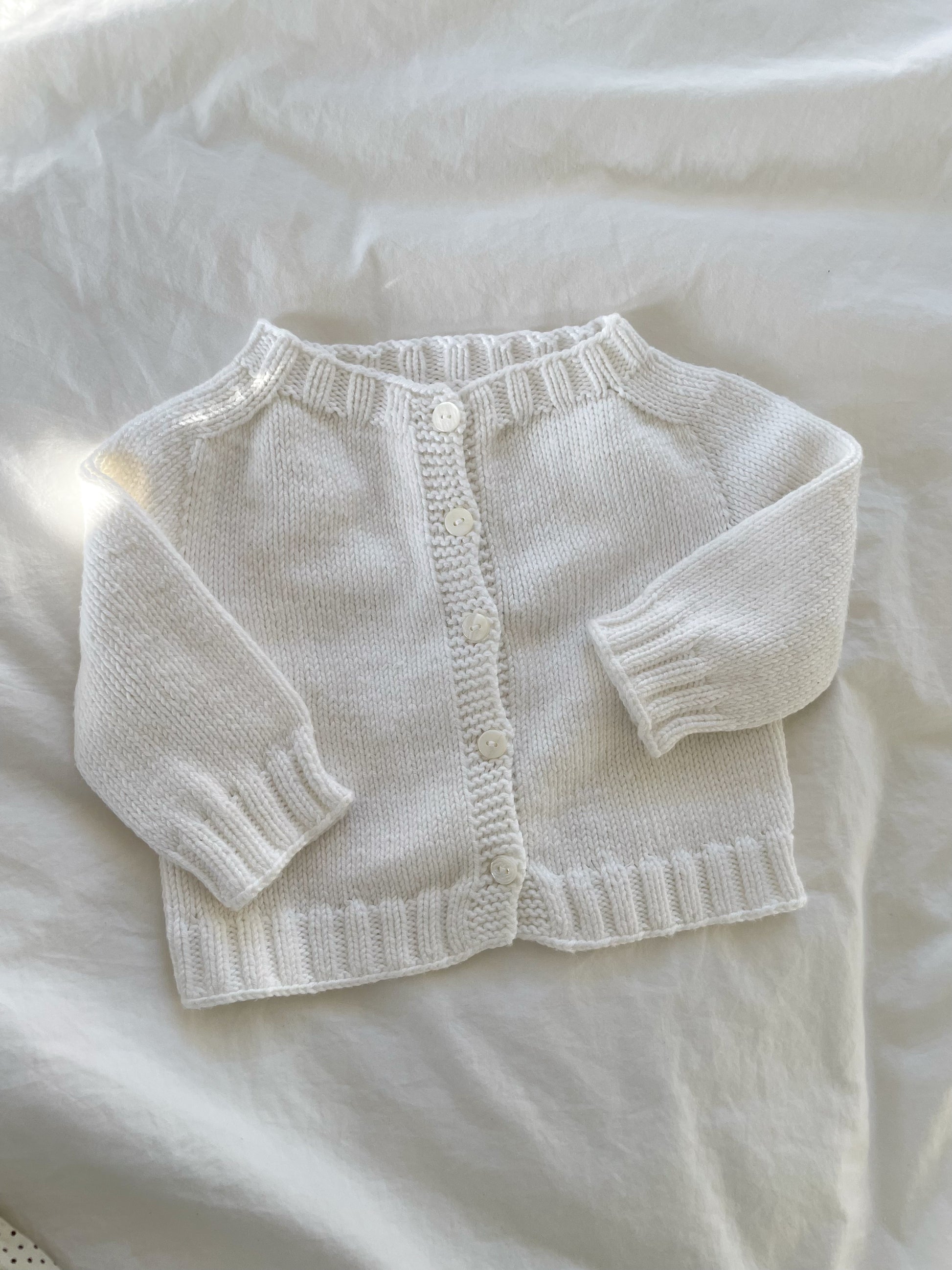 Fin hvid cardigan, strikket i babyuld og isat fine blanke knapper.