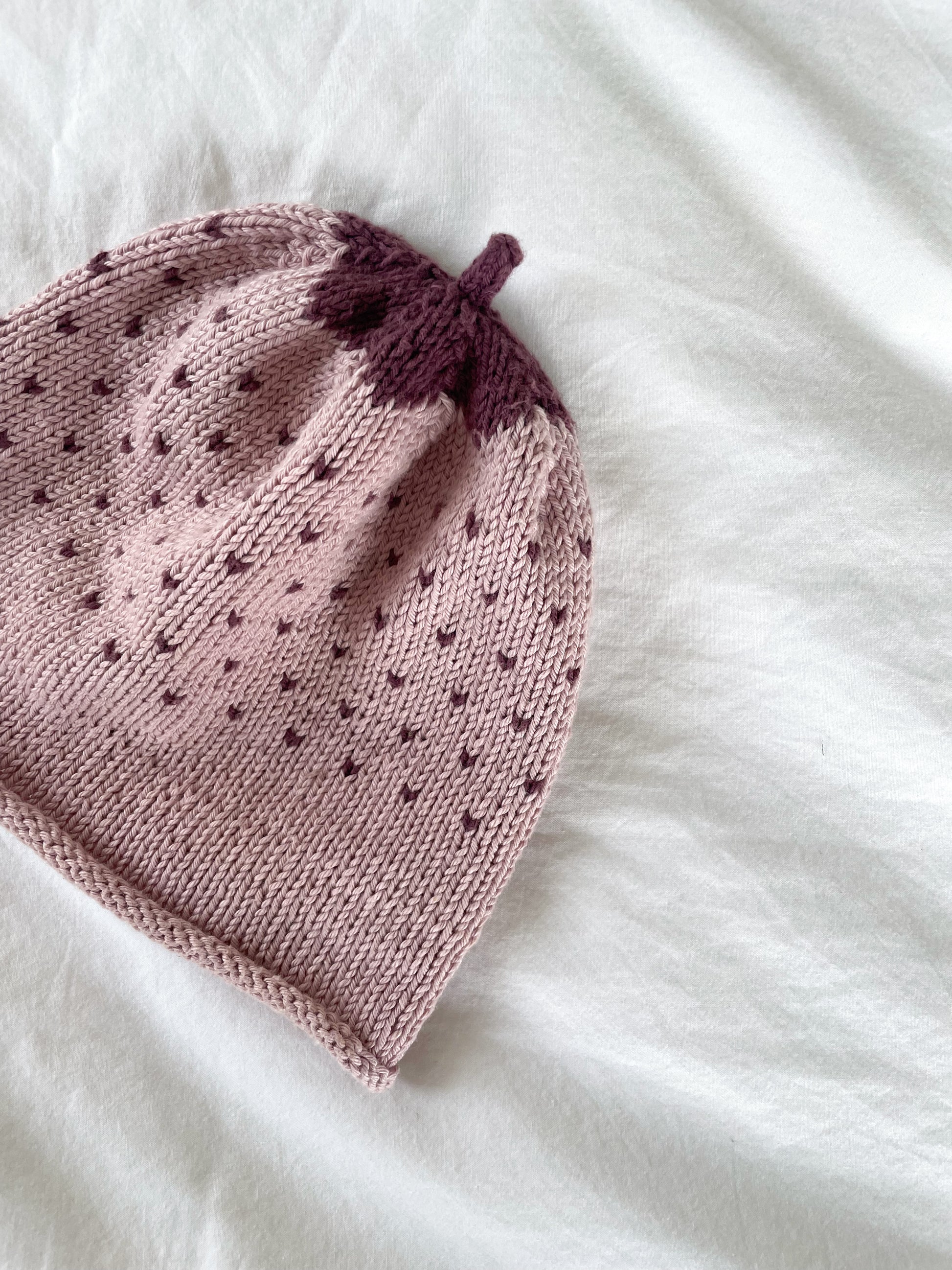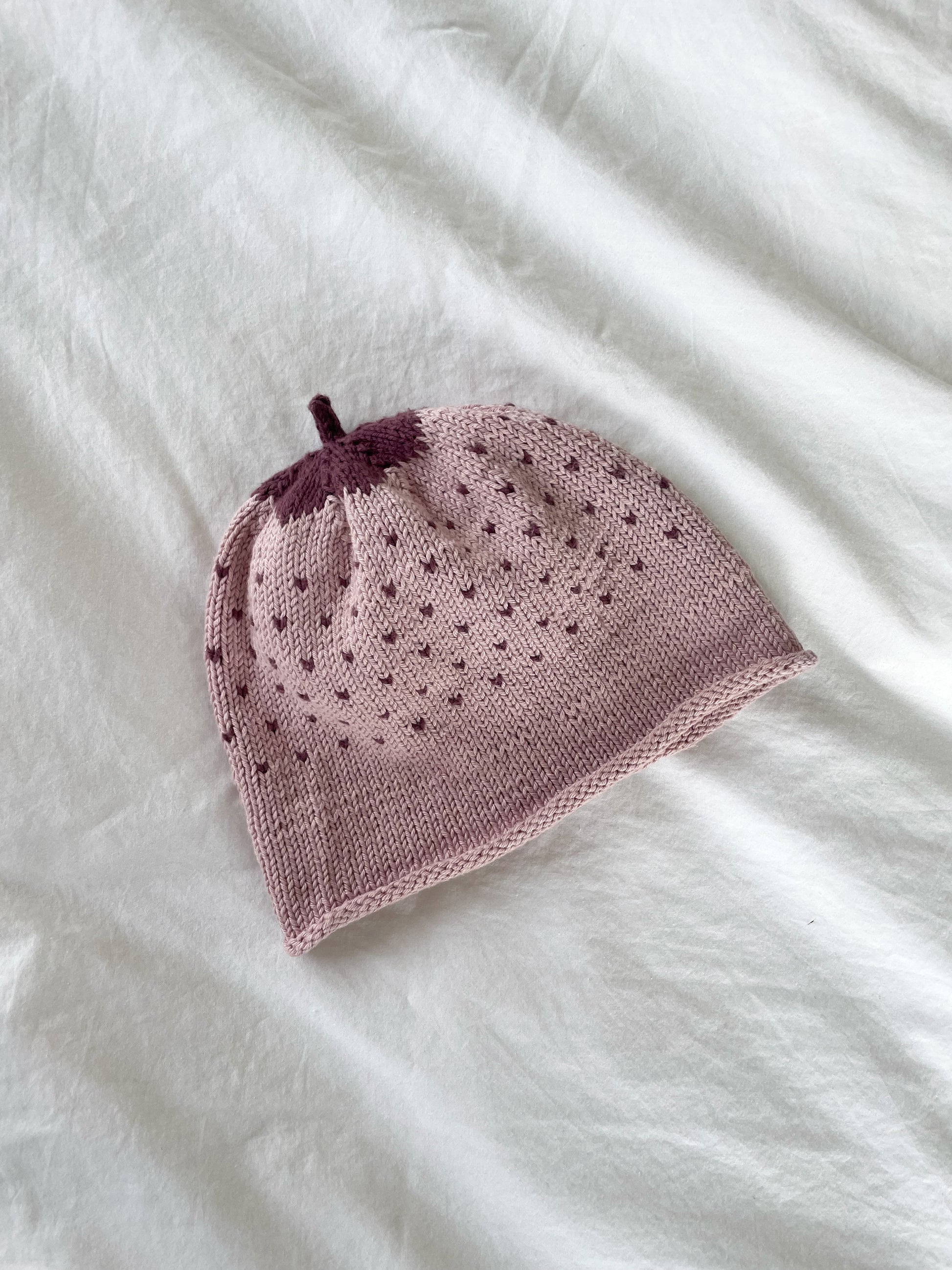 Sød jordbærhue, strikket i bomuld.StørrelseCa 18 mdrStandNæsten som ny