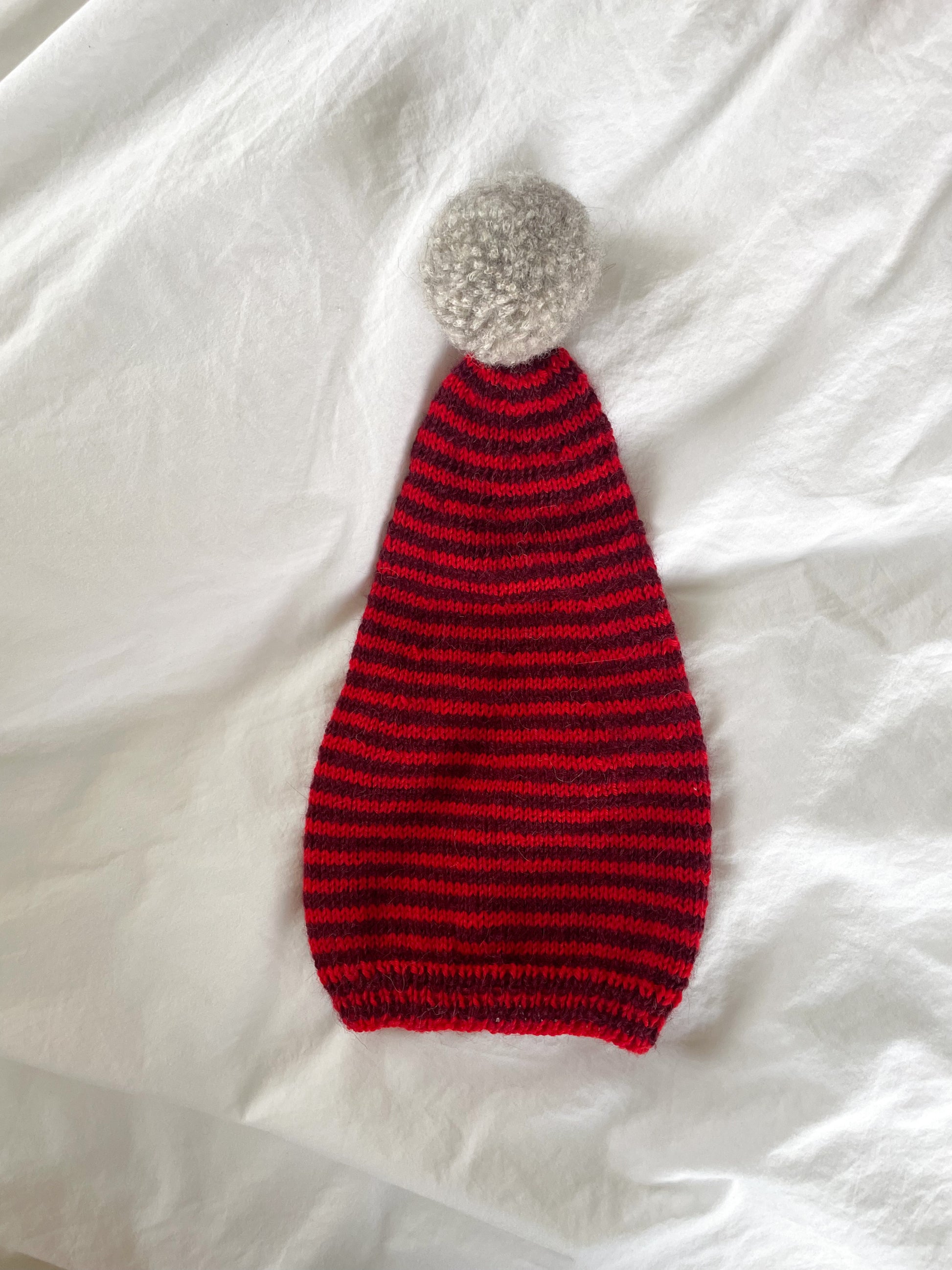 Sød lille nissehue med blød pompom, strikket i blød uld.
