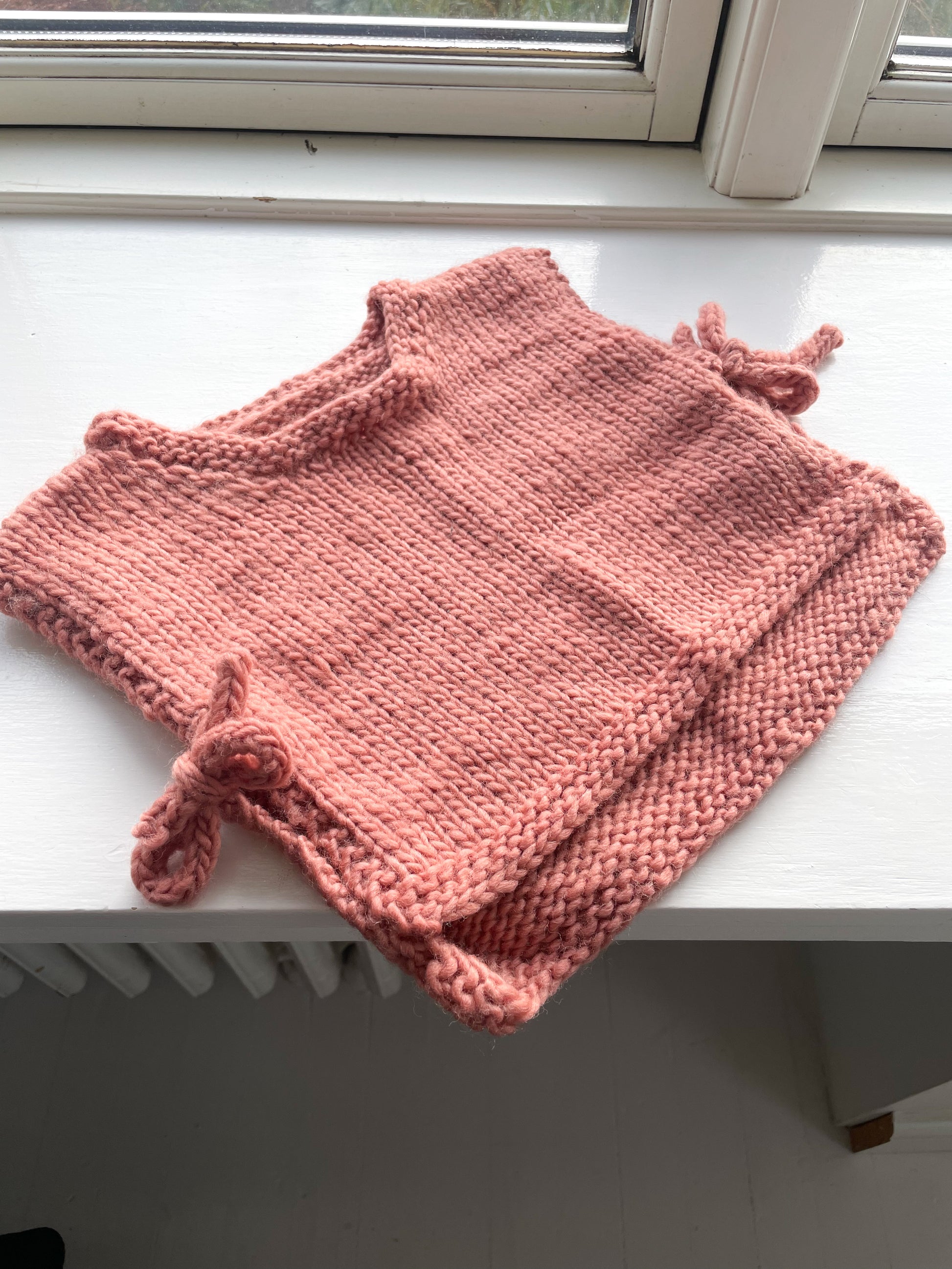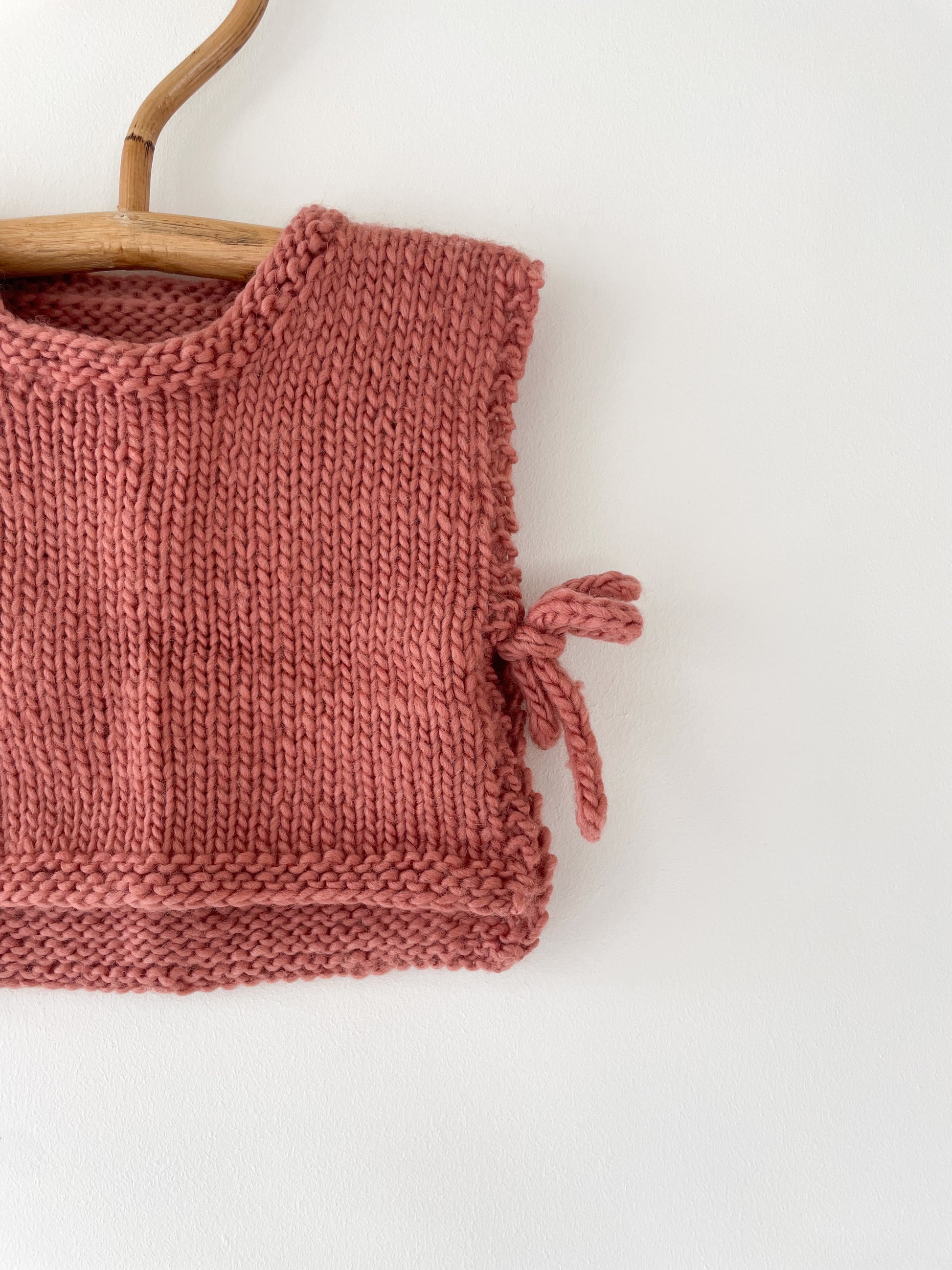 Lækker lun vest i koral med bindebånd i siderne. Strikket i blød uld.