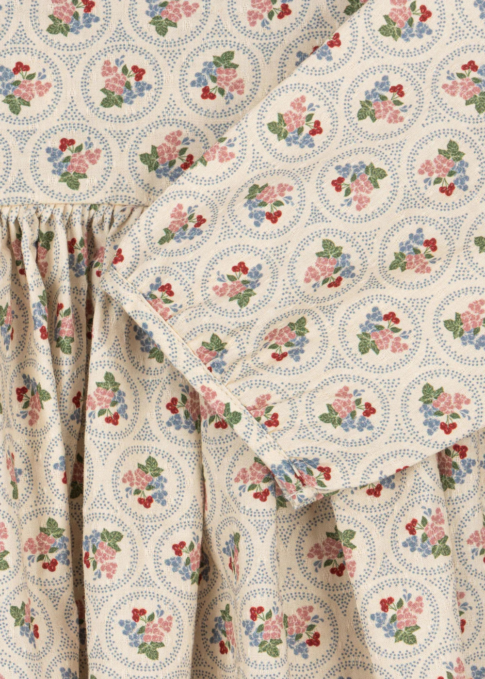 Kjole i blød økologisk bomuld med flæser ved ærmerne og sløjfedetaljer bagpå.