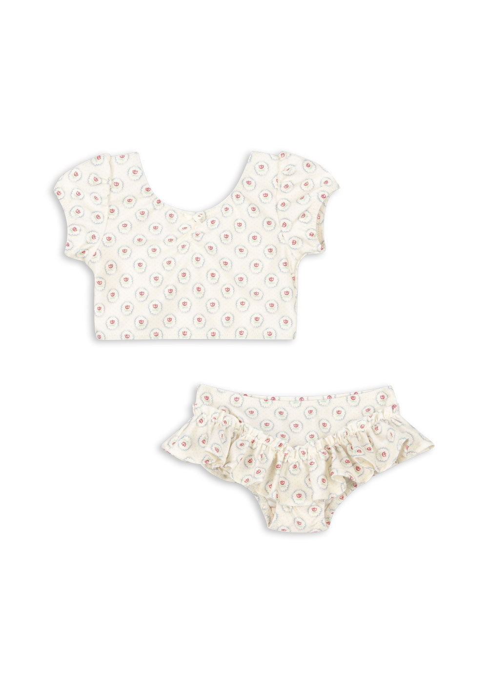 Blød bikini i elastisk og hurtigtørrende genanvendt polyamid. Designet som et klassisk todelt sæt med en kortærmet top og bikinitrusser med flæsedetaljer.