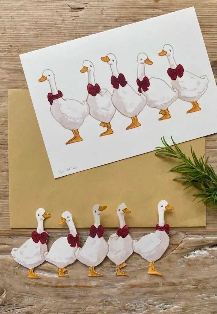 En helt række med gæs, der vralter afsted i flok! Klip de små gæs ud og stil dem på en hylde eller i vindueskarmen.