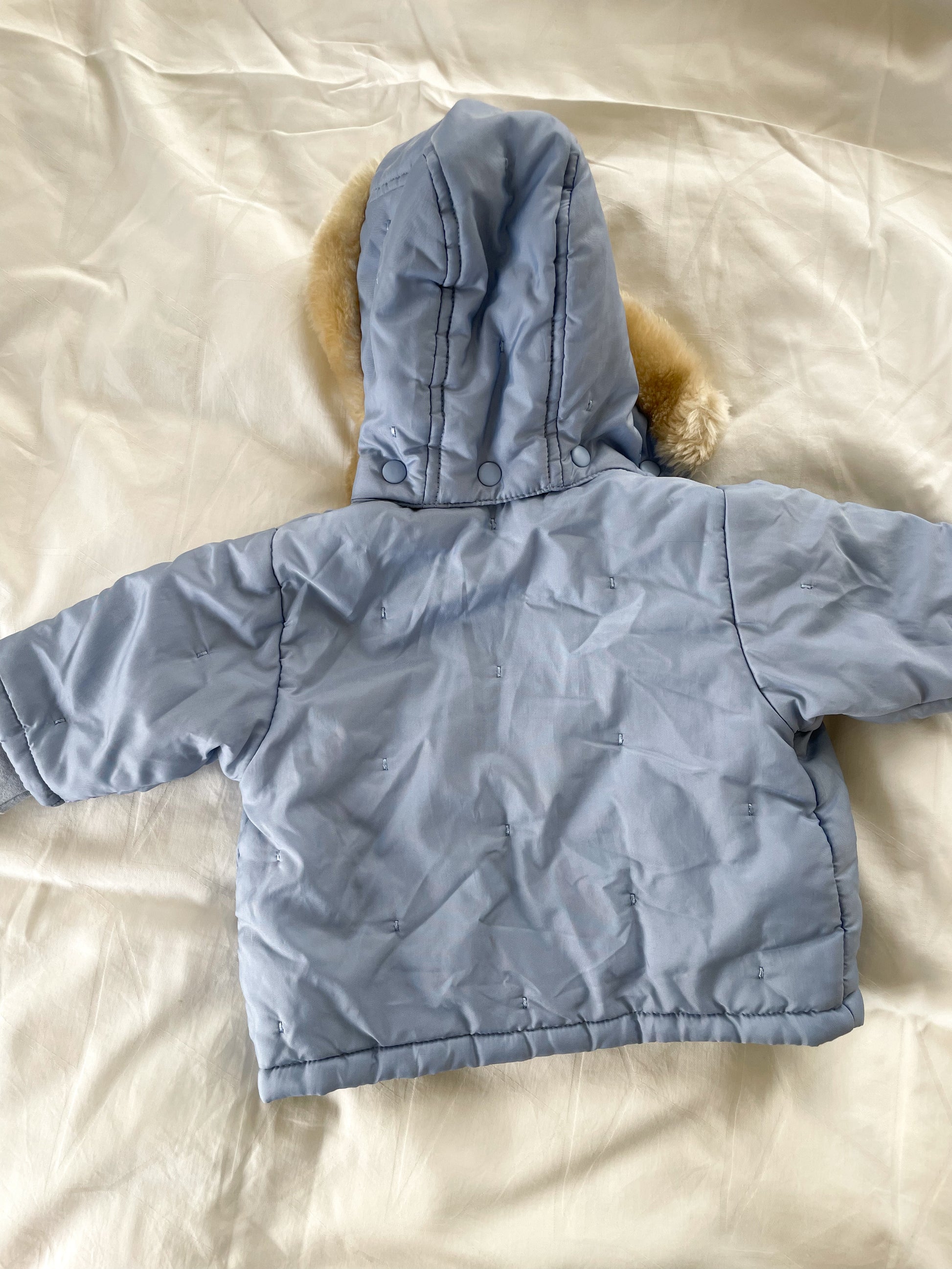 Den sødeste lille babyjakke med glat yderside og smukt foer i bomuld. Den har smarte indbyggede vanter og hætte med fake pelskant - hætten kan tages af. Vintage H&M baby
