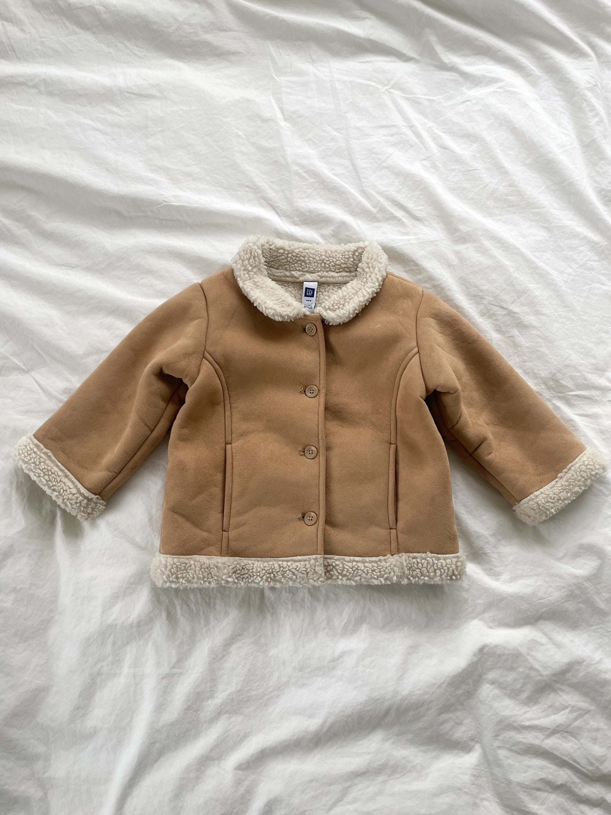 Sød jakke i 'rulamslook' med lommer i siderne, knapper og linning i teddy.