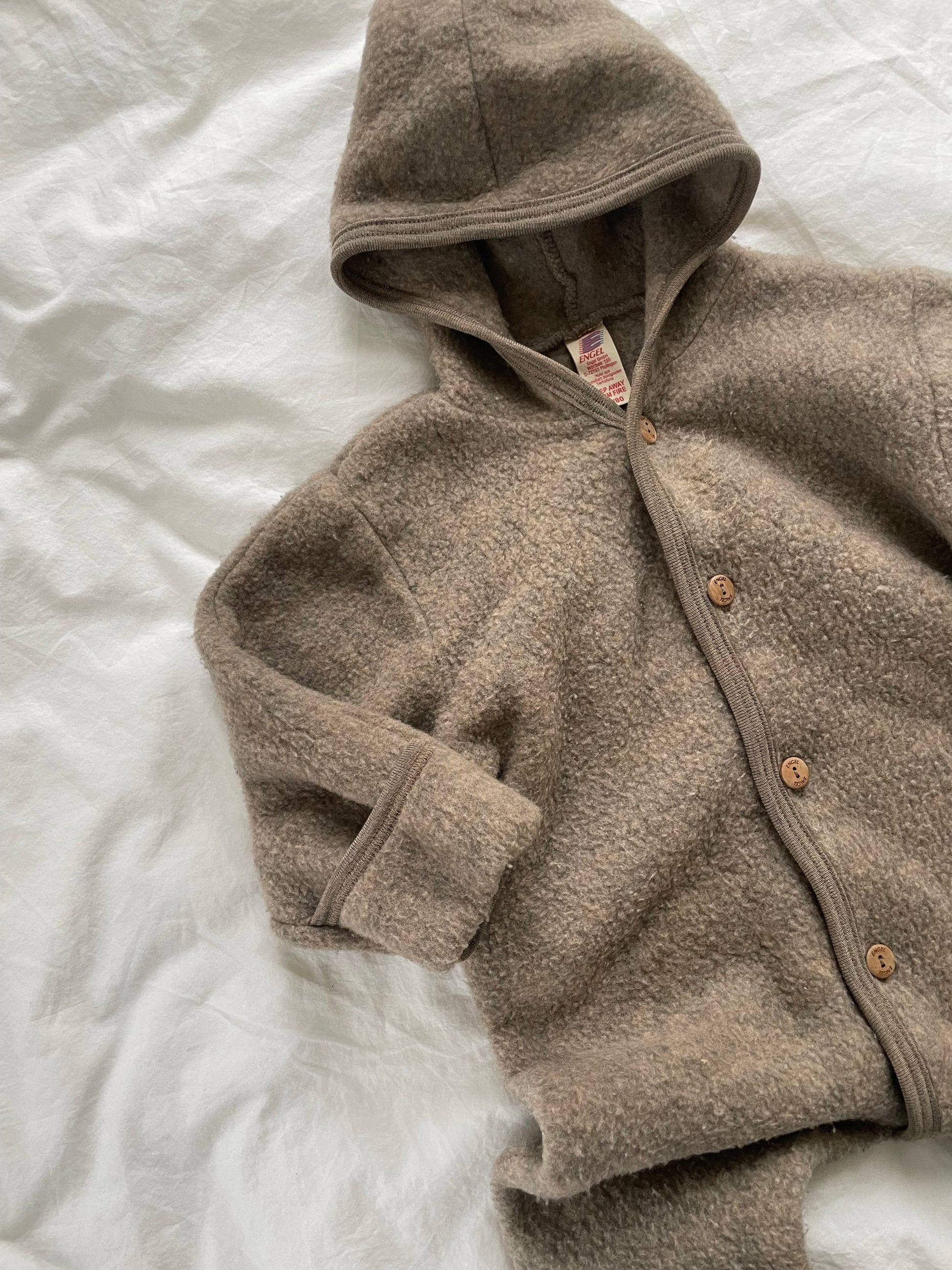 Engel jakken har fast hætte, lange ærmer og ben med praktiske ombuk og flotte træknapper.