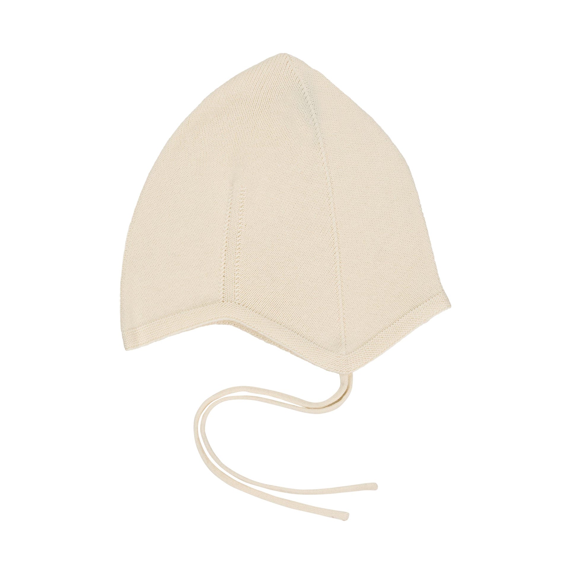 Denne babyhue er strikket i et stykke med en enkelt søm på bagsiden. Den har diskrete detaljer, der sikrer den perfekte pasform samt dekorative kanter og fine strikkede bindebånd.