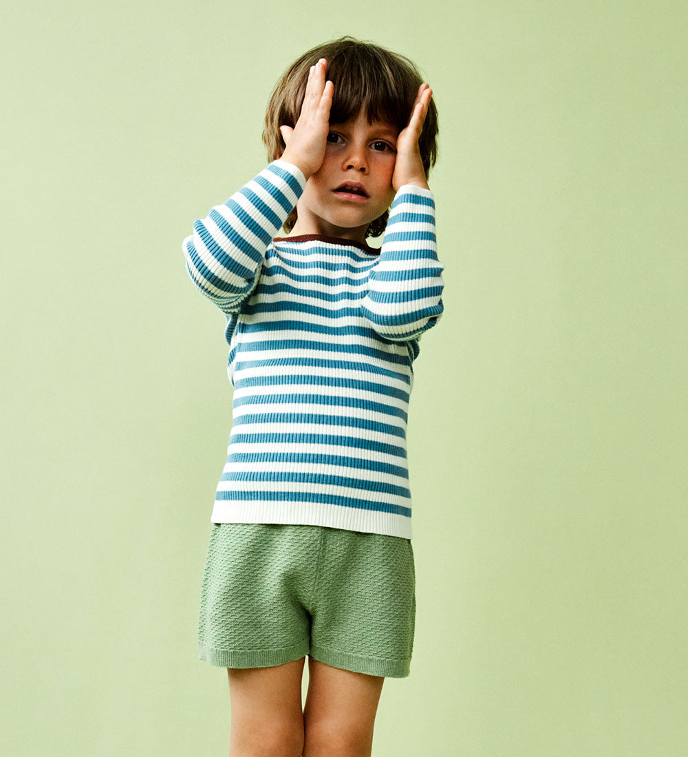 Denne langærmede ribbluse er en FUB-klassiker. Den er strikket i en fast stribet ribstruktur og har en lige smal pasform, rund hals med ribkant og diskret finish på bund og ærmekanter. Op til str. 86 har blusen en praktisk knaplukning på skulderen med perlemorsknapper. Lavet af økologisk bomuld.