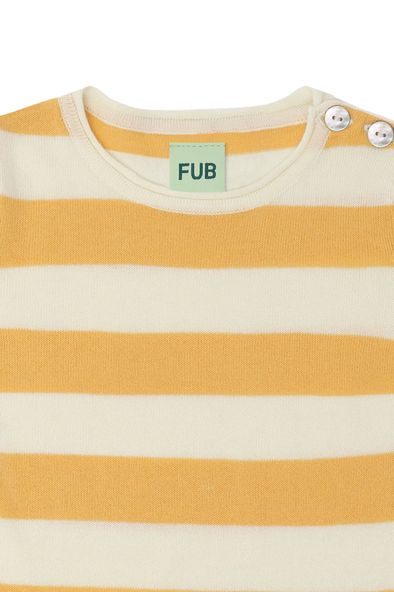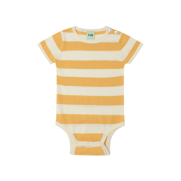 Denne stribede bodystocking er en FUB-klassiker. Den har korte ærmer, rund hals og rullekanter ved ærmer og halsudskæring. Bodyen har en praktisk lukning ved skulderen med perlemorsknapper og trykknapper forneden. Bodyen er strikket med smalle klassiske striber.