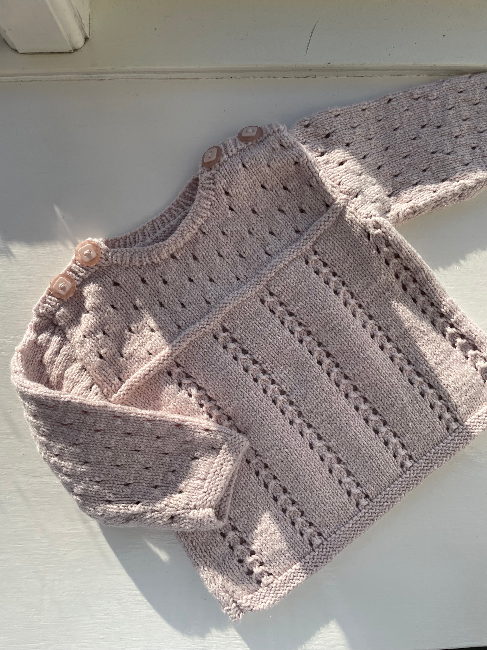 Lyserød bluse strikket i bomuld, dejlig blød. Med knapper på skuldrene for lettere at tage af- og på.