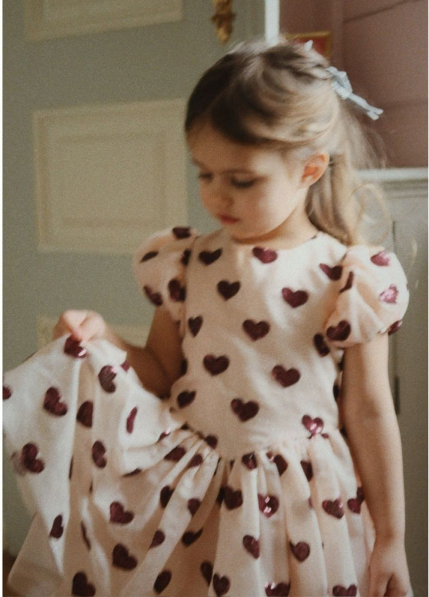 Tylkjole med pailletapplikationer. Kjolen har pufærmer og et fyldigt skørt, der svinger i takt med dit barns bevægelser.