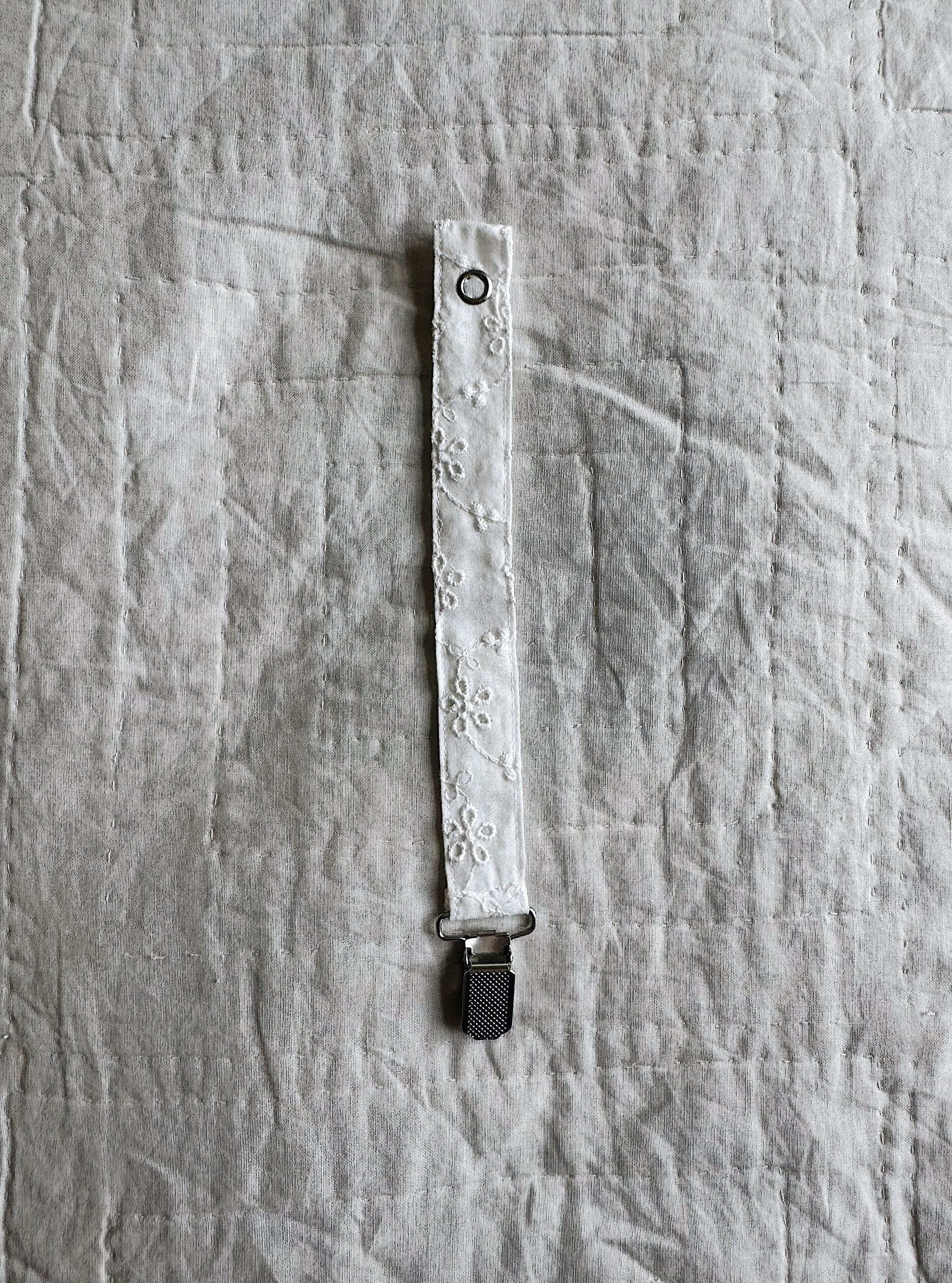 En sød sutteclips i broderie anglaise lavet af økologisk bomuld. Den er ideel til en sikker fastholdelse af din lilles sut, så den ikke falder ned på gulvet eller bliver væk. Et musthave til travle dage med en baby!