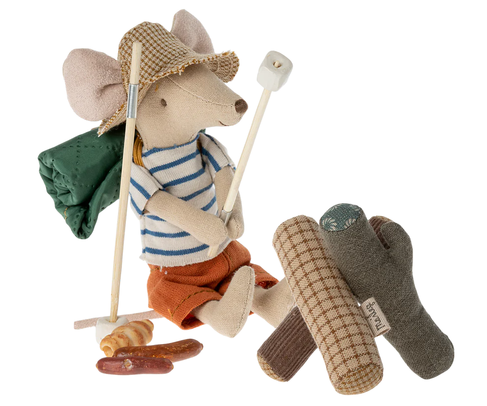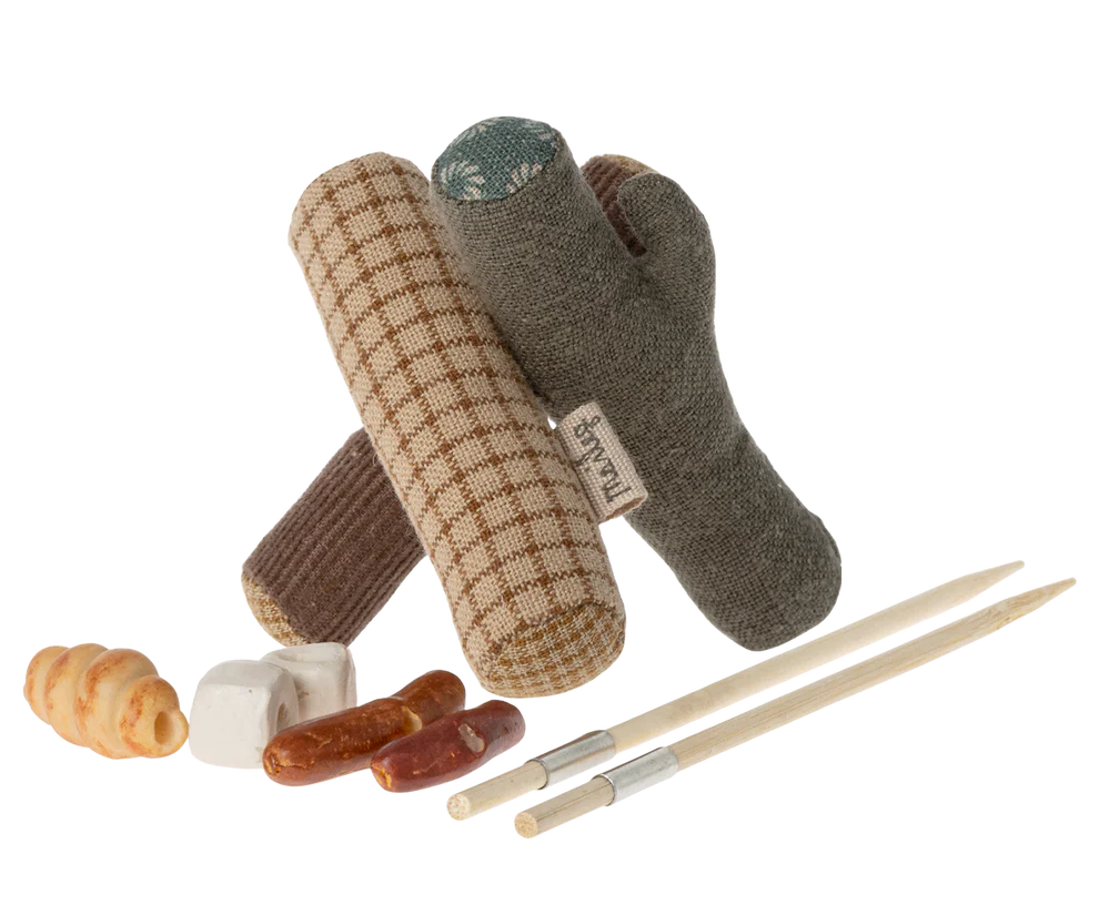 Når vandremusene er ude på tur, elsker de at sidde ved bålet og tilberede deres mad. Dette sæt kommer med pinde, mad og grene. Pindene har en lille metaldel for at sikre, at vandremusene kan holde på pindene med deres magnetpoter.
