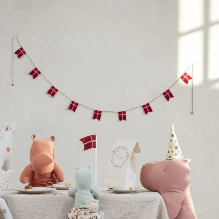Denne smukke flagguirlande er perfekt til enhver festlig lejlighed. Den er pakket i en fin æske for god opbevaring mellem hver fest. Der er 9 flag på ranken.