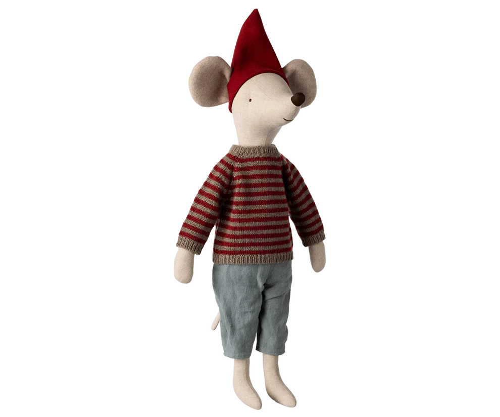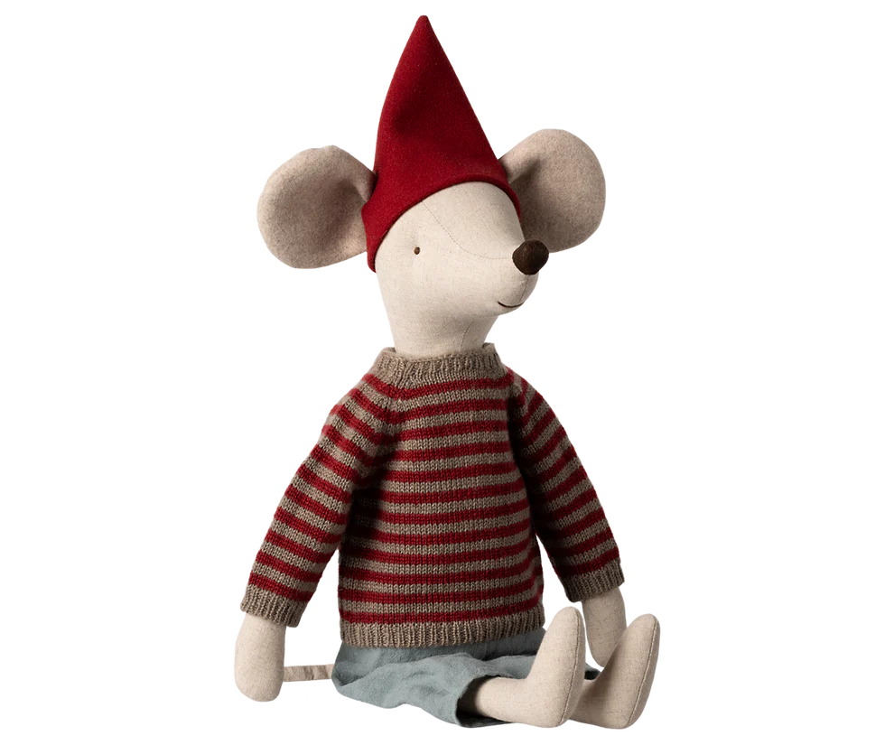 Denne maxi størrelse mus har nissehue og en varm trøje - ørene er lavet af ekstra kraftigt materiale for at holde dem varme.