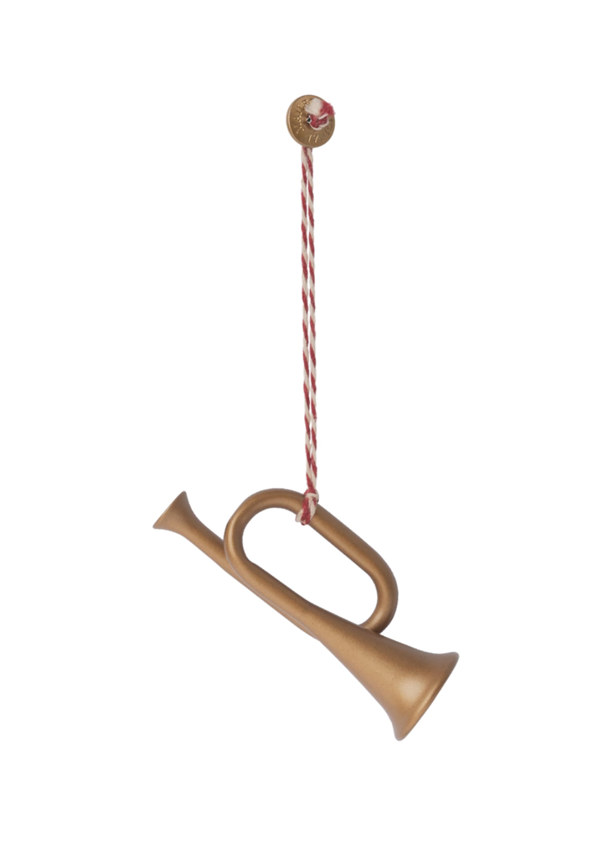 Metal trompet i guld er en smuk og stilfuld pyntegenstand. Den er håndmalet og dekoreret med et smukt rød/hvidt bomuldsbånd. Denne trompet er en fantastisk tilføjelse til ethvert juletræ eller gren. Den kan nemt kombineres med andre ophæng for at skabe en personlig og stilfuld samling. Trompeten kommer i en smuk Maileg æske.