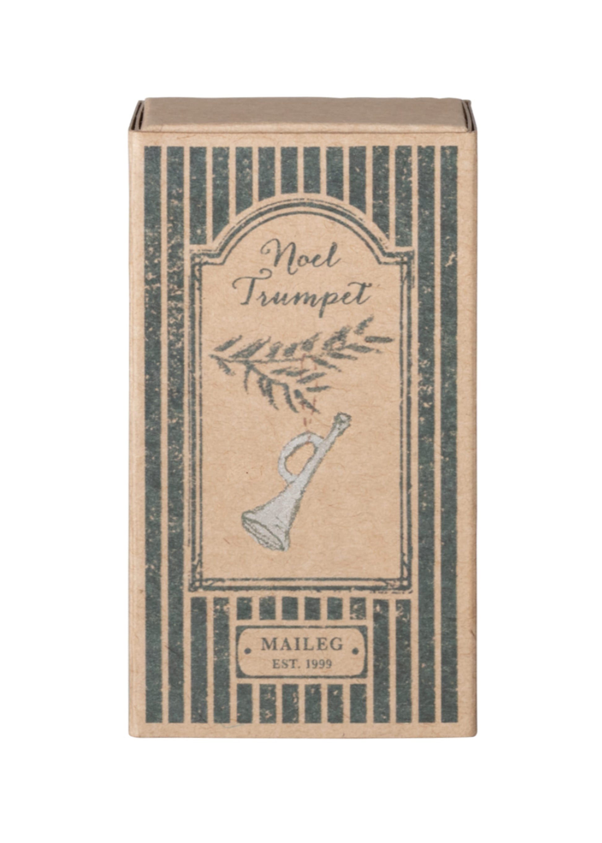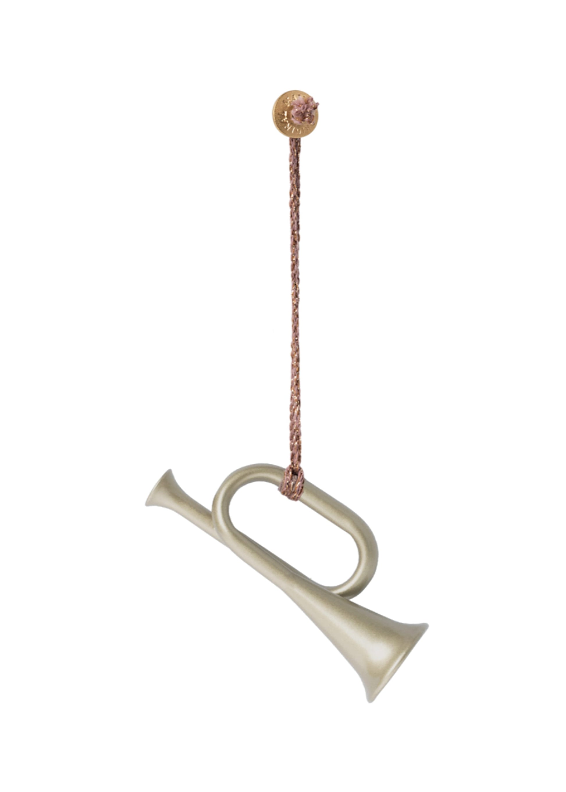 Metal trompet i sølv er en smuk og stilfuld pyntegenstand. Den er håndmalet og dekoreret med et smukt guld/lyngfarvet bånd. Denne trompet er en fantastisk tilføjelse til ethvert juletræ eller gren. Den kan nemt kombineres med andre ophæng for at skabe en personlig og stilfuld samling. Trompeten kommer i en smuk Maileg æske.