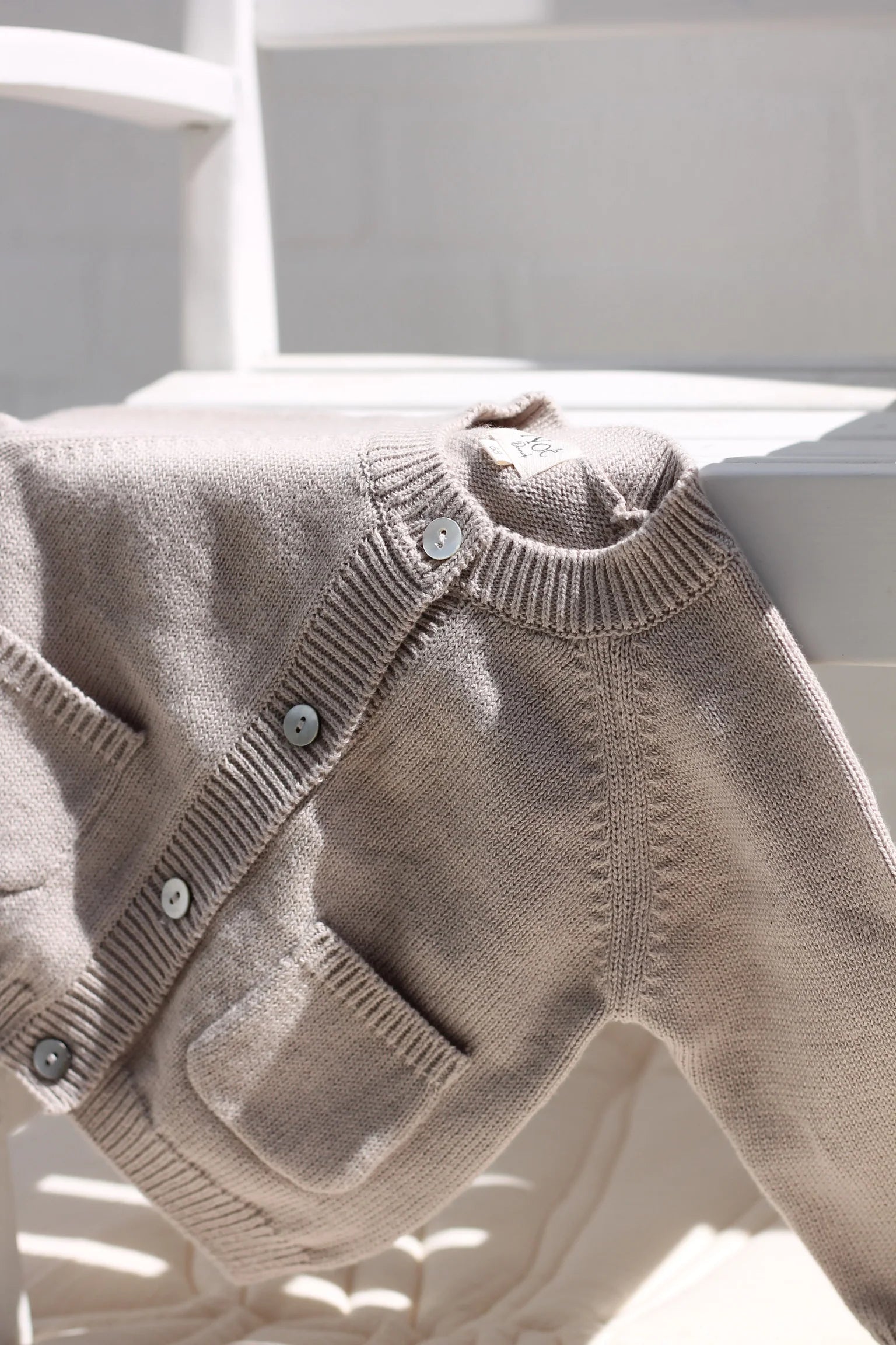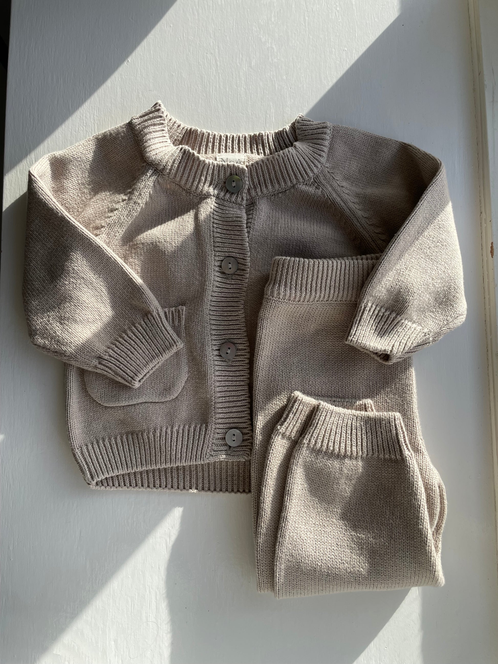 Skøn blød cardigan & matchende bukser, strikket i beige økologisk bomuld.