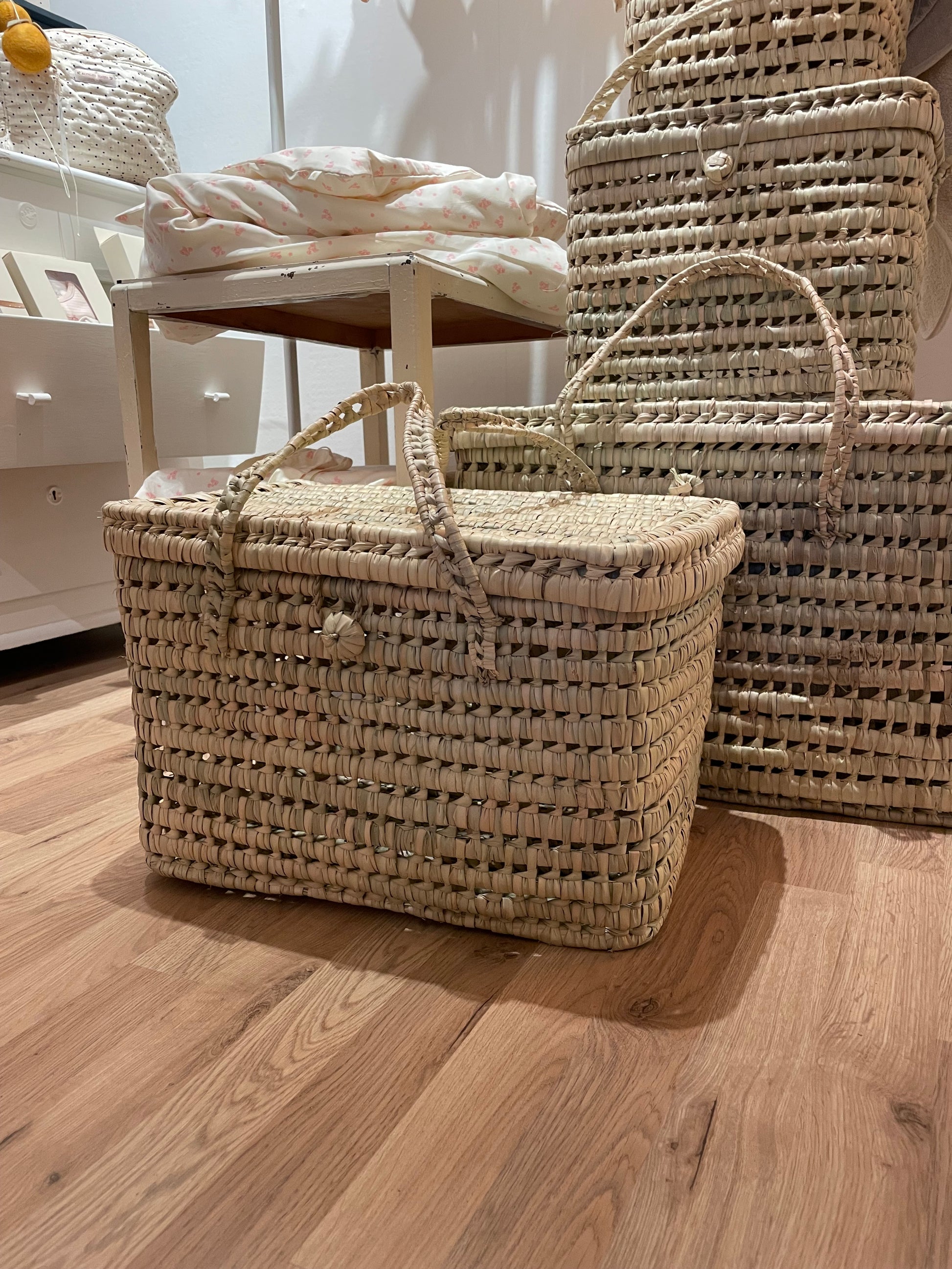 Stor håndlavet kurve med låg og 2 hanke. Den er oplagte til legetøj på børneværelset eller opbevaring i entreen.