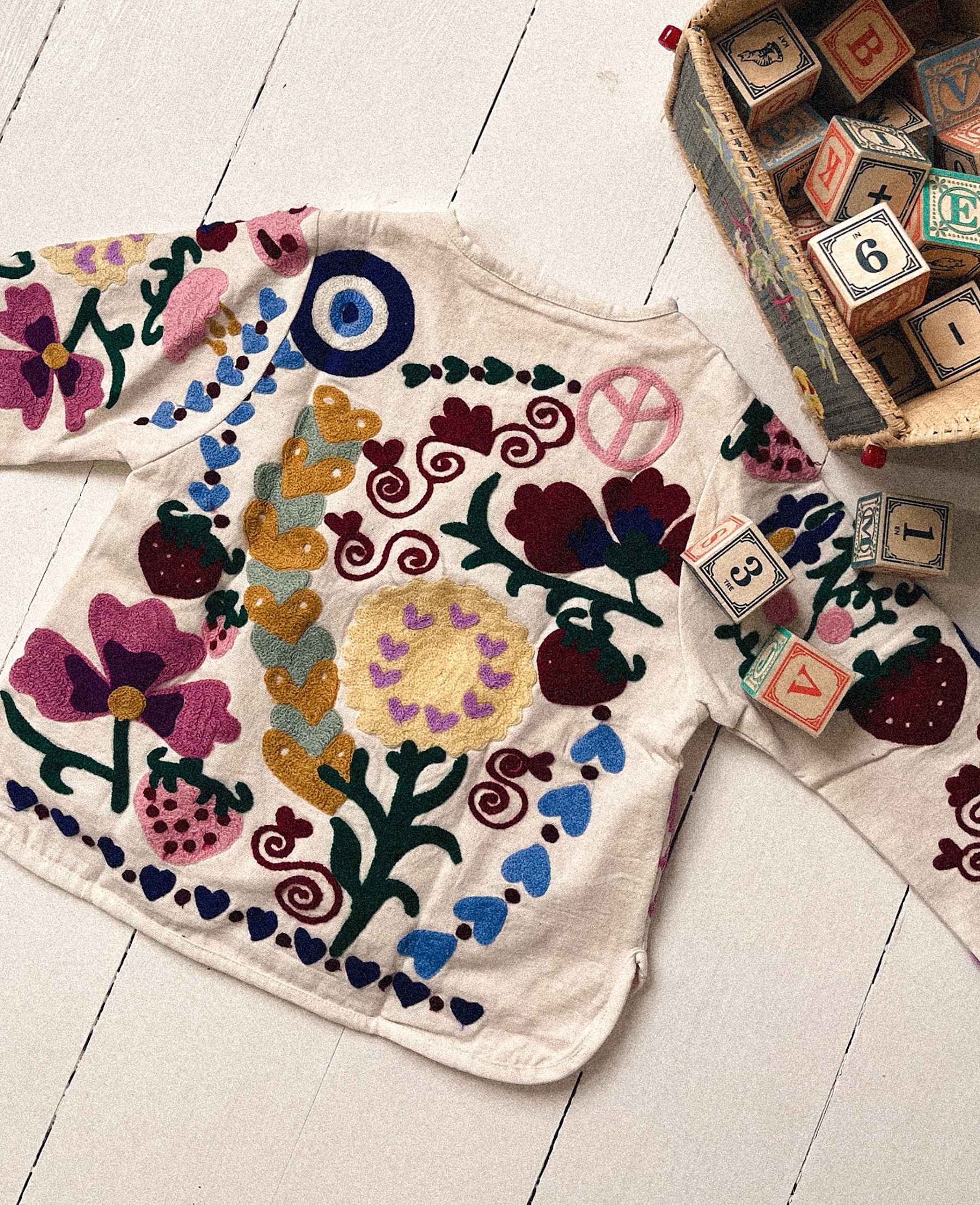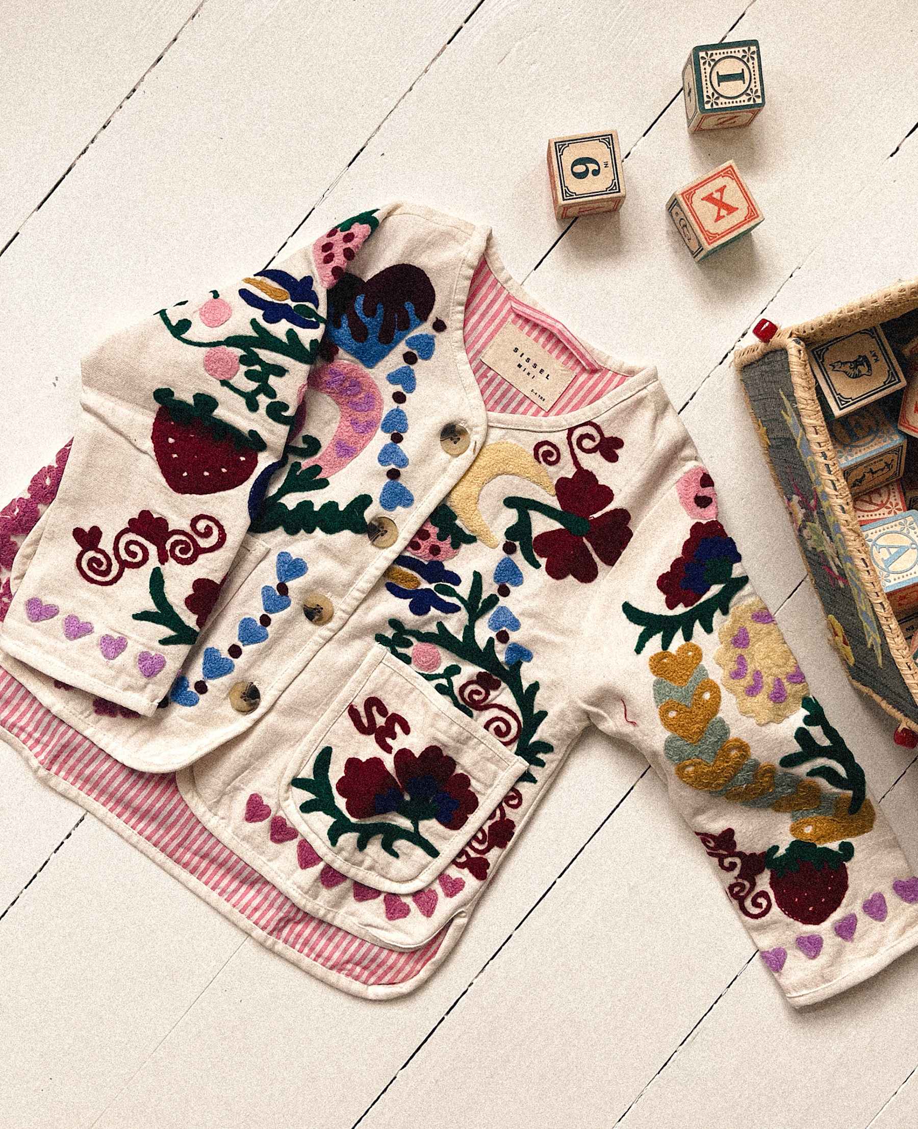 Maggie Mini jakken er lavet af bomukdskanvas med super smukke Suzani broderier fra Sissel Edelbo.
