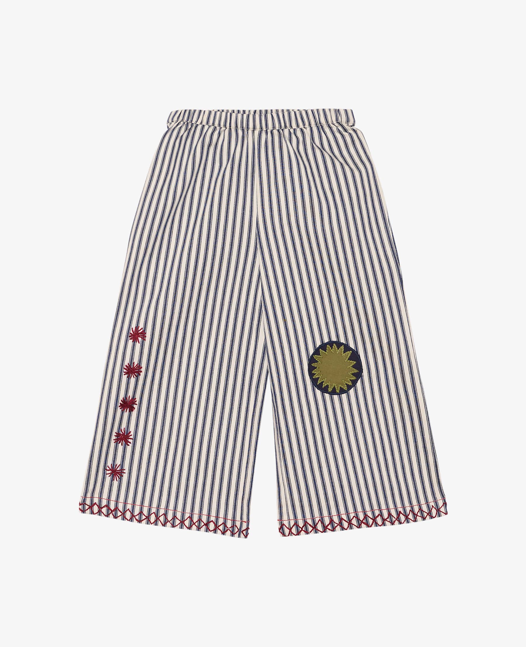Saxo MINI Pants er bløde bukser med bred pasform og er fremstillet af rester af bomuldslærred i garnfarvede milk lad striber. Bukserne har en enkelt baglomme og er lavet med elastik indvendig linning. De er smukt dekoreret med charmerende motiver, såsom en løve, en fugl og et sødt æsel, lavet af en blanding af reststoffer, ensfarvet bomuld og delikat broderi. Alle topsømmene har en iøjnefaldende rød farve for et færdigt look.