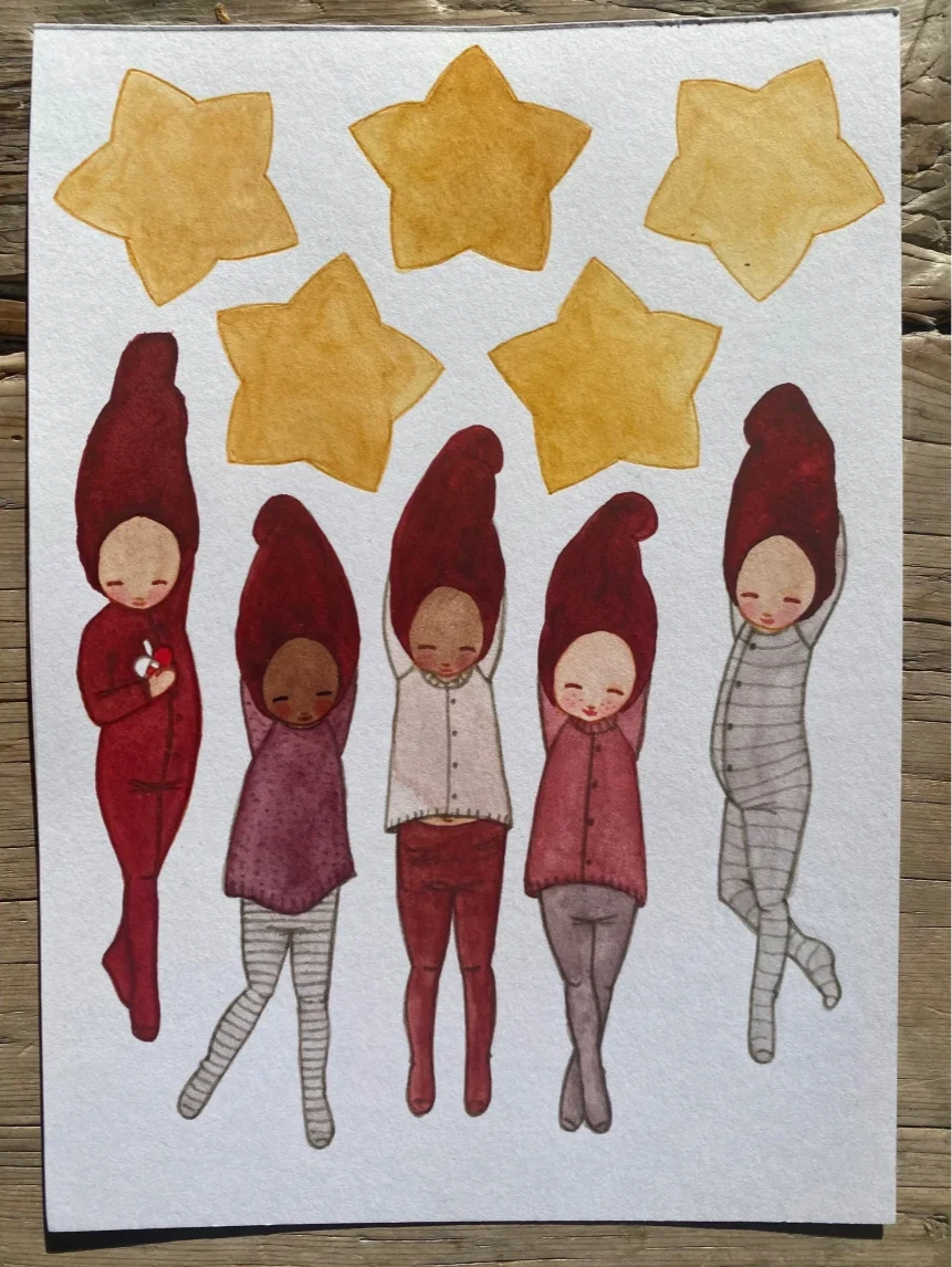 Fem små nisser, der hænger i hver sin stjerne - klar til at lyse op for os i denne mørke tid.