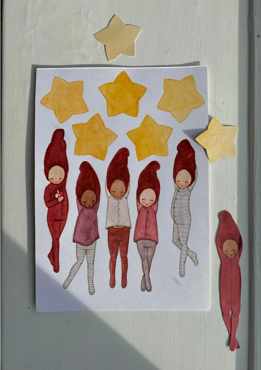 Klip dem ud og lim eller sy dem sammen, så hver nisse hænger i sin egen lille stjerne.